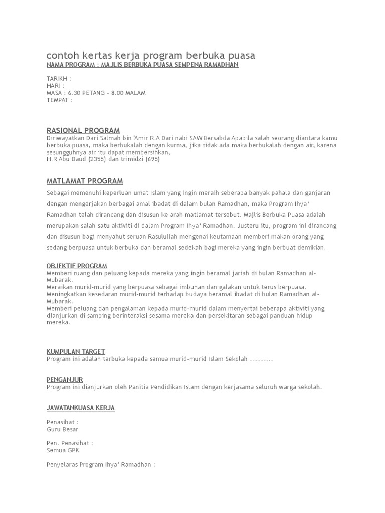 . Kertas kerja majlis khatam al-quran dan berbuka puasa peringkat sekolah sekolah kebangsaan felda tenggaroh 4 felda tenggaroh 4 86810 mersing johor kelolaan panitia agama islam dengan kerjasama kelab guru tarikh. Dalam contoh contoh surat pengesahan untuk buka akaun bank. Kertas kerja majlis berbuka puasa bersama anak-anak yatim dan asnaf zakat sk hulu bernam tahun 2015 m 1436 h anjuran sk hulu bernam dengan kerjasama panitia pendidikan islam persatuan ibu bapa dan guru pibg semua guru dan kakitangan sk.