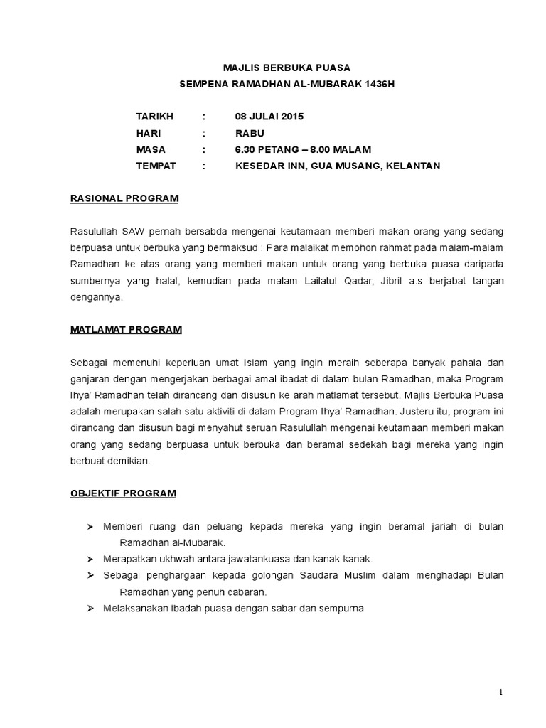 Kertas Kerja Majlis Berbuka Puasa 2017 Pdf Kertas kerja majlis berbuka puasa bersama anak-anak yatim dan asnaf zakat sk hulu bernam tahun 2015 m 1436 h anjuran sk hulu bernam dengan kerjasama panitia pendidikan islam. Menu buka puasa sehat ala Food Combining tidak hanya ditujukan bagi orang yang sedang sakit. Teks ucapan perasmian program berbuka puasa.